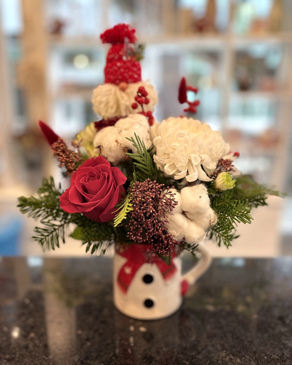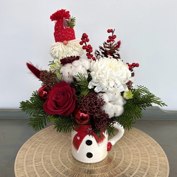 The cheerful Christmas composition is associated with the Scandinavian mythical creature ‘tomte/nisse’, which helps Santa Claus deliver gifts at the door. The arrangement is made in a Christmas mug with a mix of Christmas greenery, flowers in traditional holiday colors: chrysanthemum, carnation, skimmia, cotton, etc.