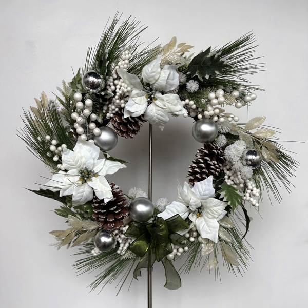 Classic artificial Christmas wreath is decorated with a mix of artificial pine greenery, white poinsettia flowers, silver baubles, white berries, and pinecones. It features a simple green bow