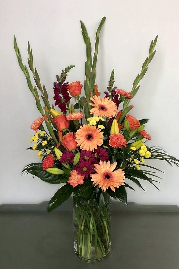 Harmony is achieved when all the elements of an arrangement go nicely together and are suitable for the purpose of the design. This arrangement combines a harmonious blend of terracotta and crimson flowers – roses, gerberas, gladiolus, snapdragons, lilies, and mix of mums, creating a stunning visual poem that speaks directly to your hearts.