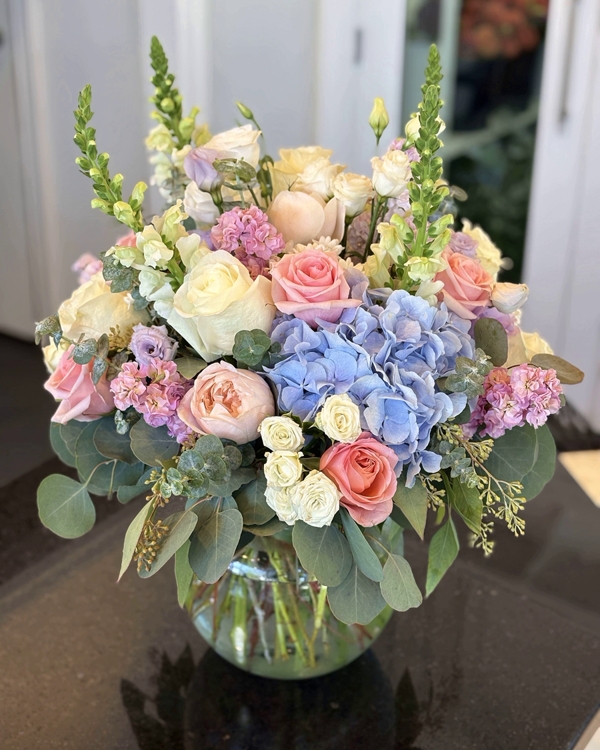 A lush, garden-style floral arrangement in soft pastel colors is presented in a clear, round glass vase. The arrangement is full and rounded, featuring a mix of blooms that appear to include light blue hydrangeas, pale pink and cream-colored roses, and tall spires of white or light green snapdragons or stock.