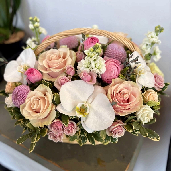 An elegant floral basket arrangement is prepared with many expensive and luxury flowers such as white phalaenopsis orchid blooms, pink disbuds "Momoko", light pink garden and spray roses, fragrant stocks, and some greenery foliage.