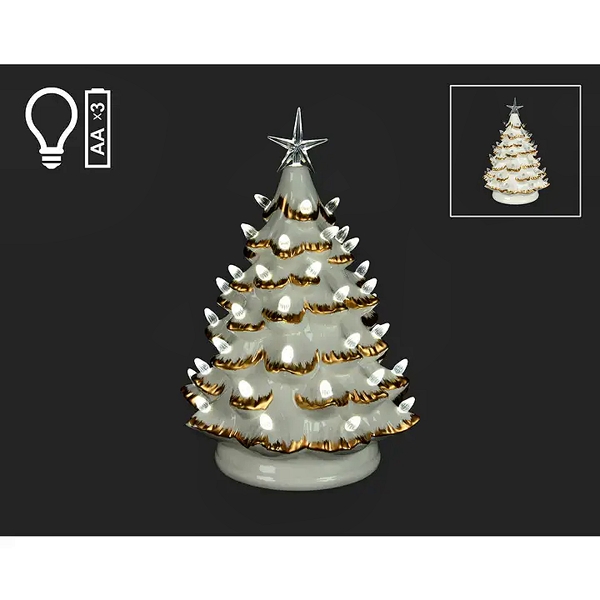 A white ceramic tabletop Christmas tree with a glossy, vintage-inspired design. The tree is pre-lit with numerous clear or warm white LED lights that are designed to look like traditional bulbs. It is topped with a clear or silver star finial that also illuminates. The graphic in the top left indicates that the lights are battery-operated, requiring three AA batteries,14” in height.