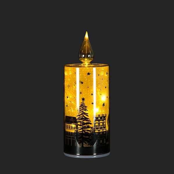 A battery-operated LED glass candle featuring a charming, festive design. The candle has a transparent, glossy cylindrical glass exterior that glows with a warm, amber light.