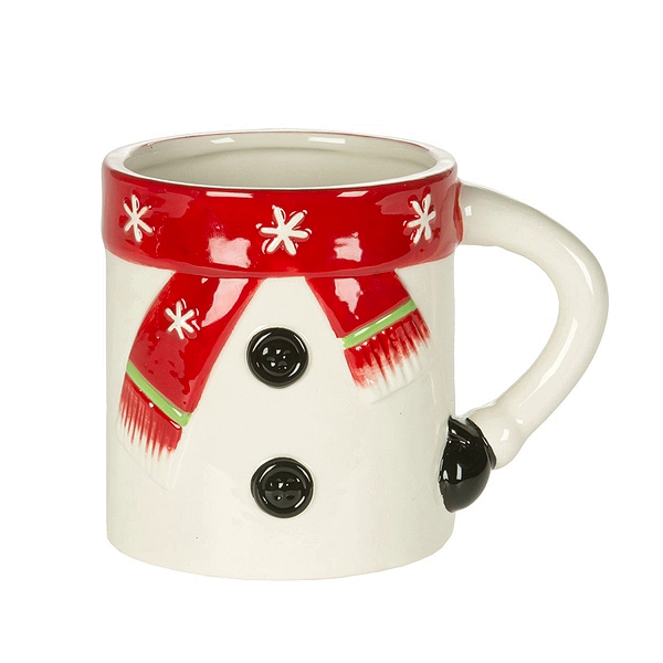 A white ceramic coffee mug with a glossy finish, designed in the style of a snowman's torso. It features a red scarf detailed with green fringe wrapped around the neck area, decorated with white snowflake accents.