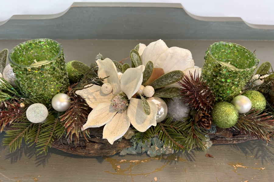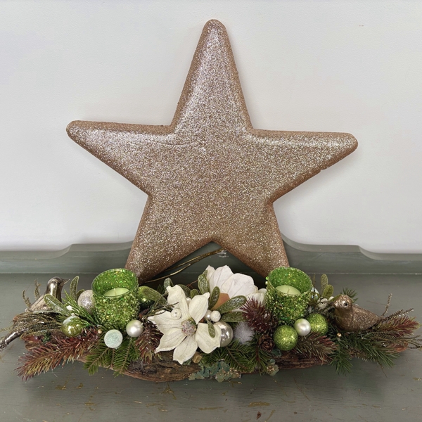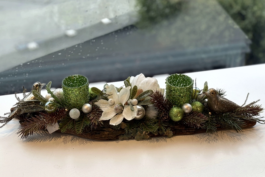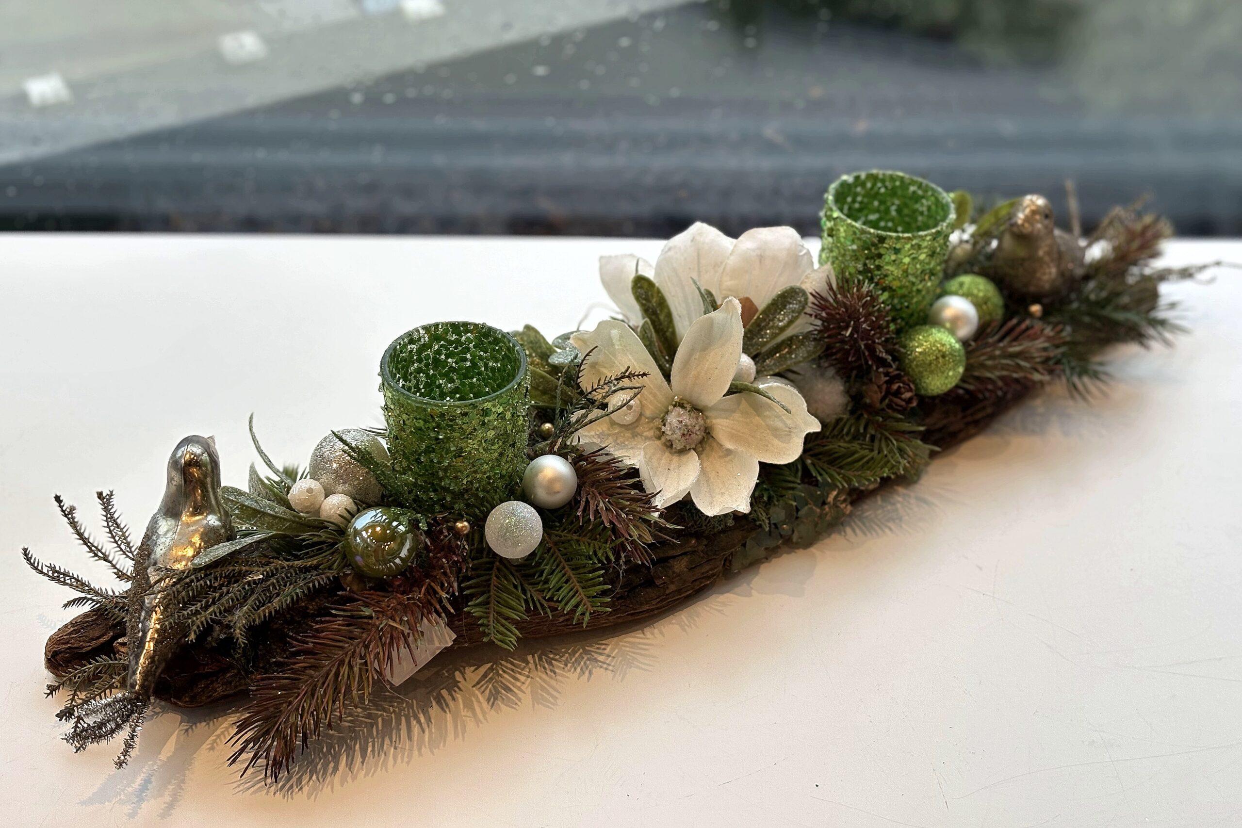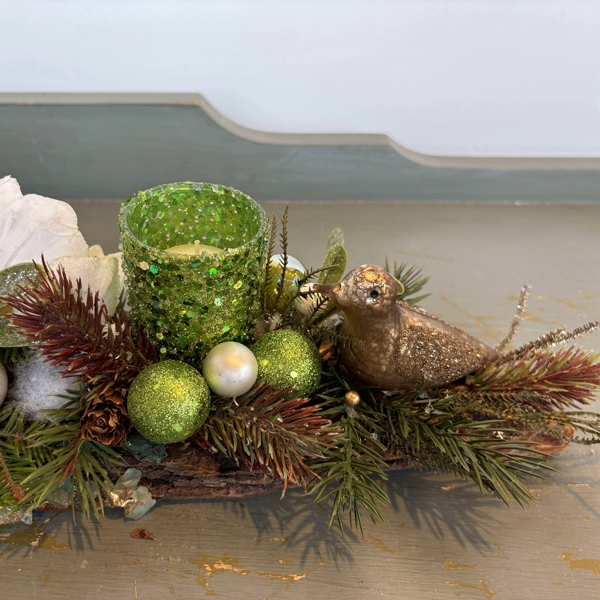 Hand-crafted Christmas centerpiece on a driftwood base with two sparkly green candleholders, some rustic decorations, small Christmas balls, and two glass birds ornaments. This arrangement is presented only in a single version.