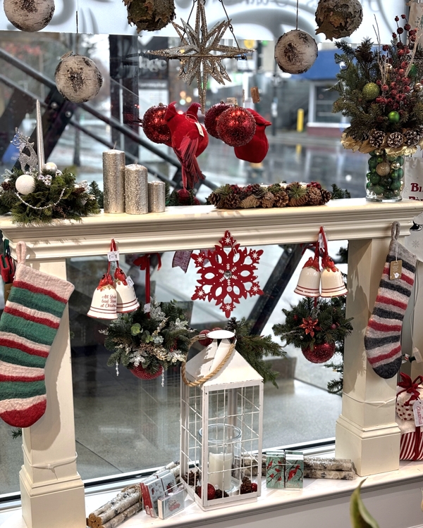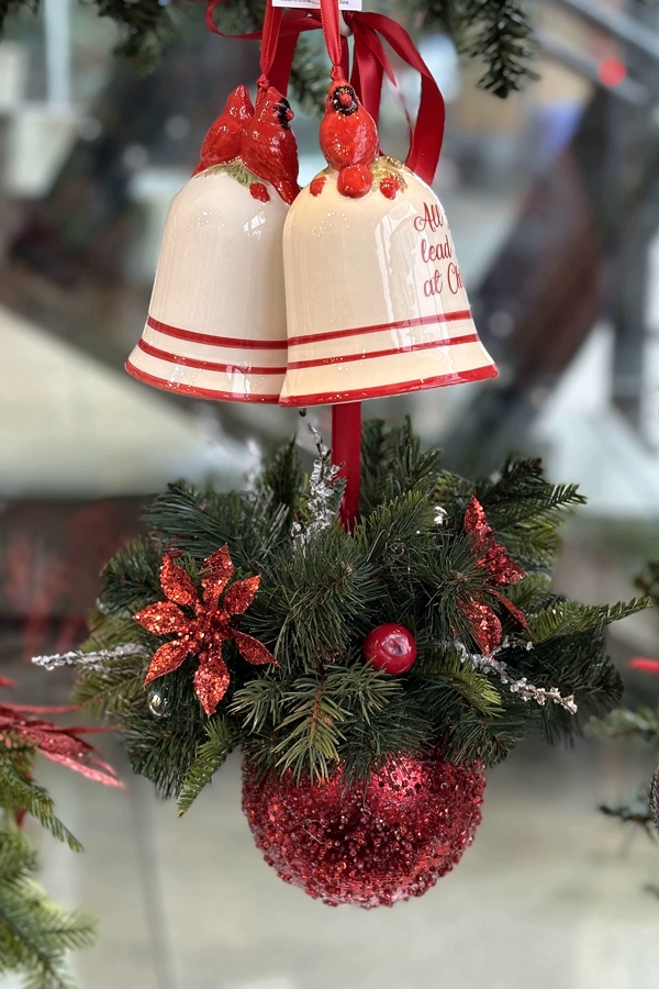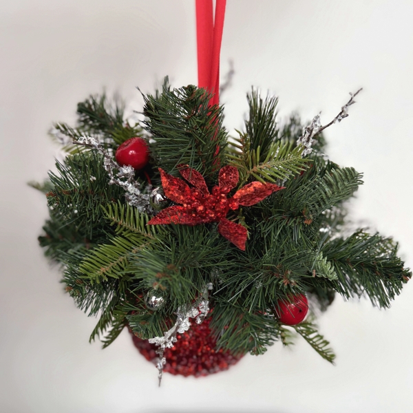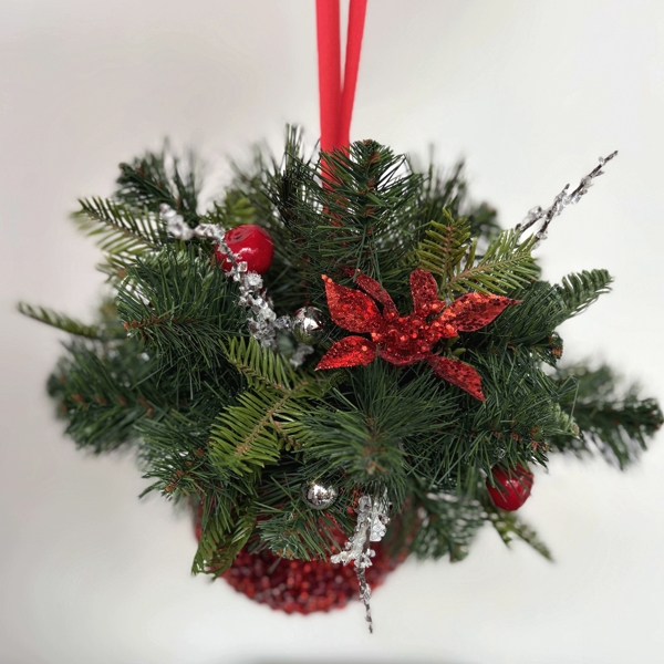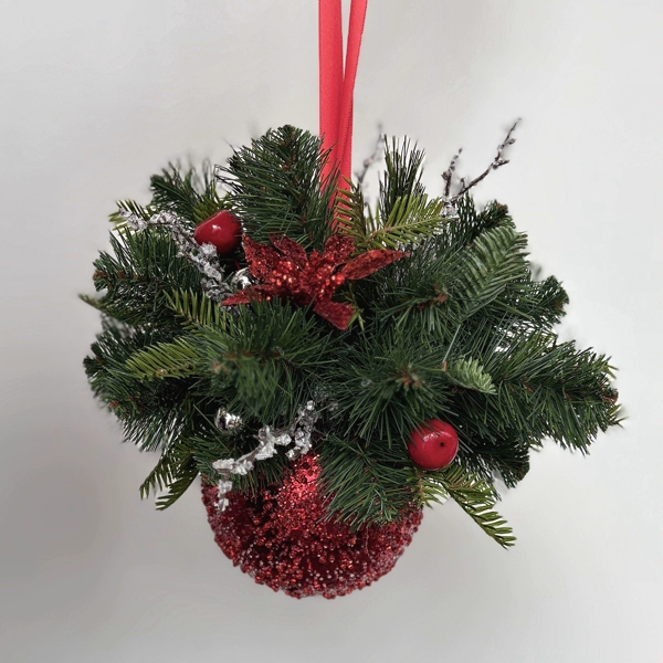 5" Red pimply-shiny ball decorated with artificial Christmas greenery, red ornaments, and icicles.