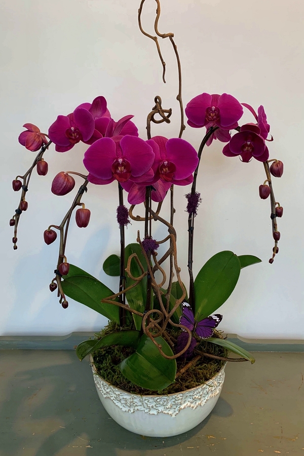 A luxury purple orchids planter in a large ceramic pot decorated with some tree branches, moss and butterfly. The type of pot may vary depending on availability.